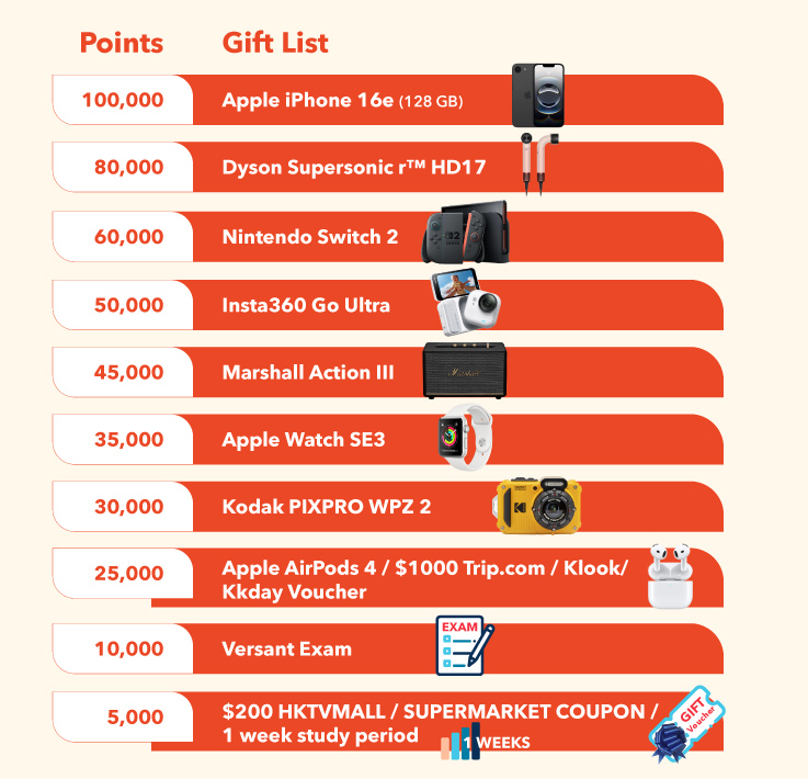 Wall Street English reserved the rights to cancel any redemption request and return the points if the requested prizes are not in stock.